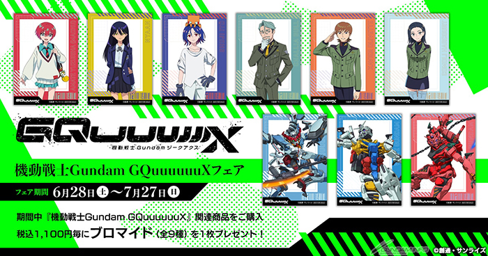 '機動戰士高達GQuuuuuX“相關角色周邊商品每1,100日元(含稅),或書籍、CD、Blu-ray、DVD(含稅1,100日元以上)每1,100日元(含稅),即可獲贈特別”溴化物“(共9種/托盤迪武規格)1張”