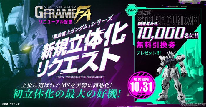 然後,為了紀念「G FRAME FA」誕生,還舉辦了商品化願望企劃。不但會從得票數前段的機體中實際進行商品化,還會從投票的人之中抽中10,000名,贈送特製「G FRAME FA 突擊高達(未啟動模式)」的“免費兌換券”,千萬別錯過囉。