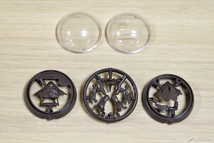 分解膠囊後,上下透明蓋和變成膠囊型(圓)的零件框3個。可以看到零件框上有非常小的零件。