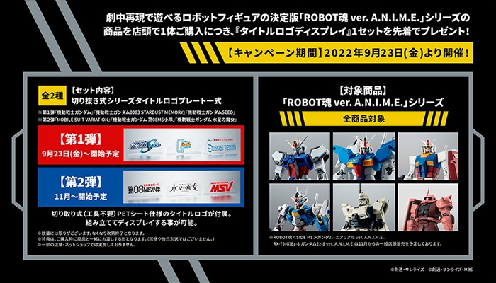 「ROBOT魂 ver. A.N.I.M.E. 」系列的商品只要在店面每購買一台「ROBOT魂 ver. A.N.I.M.E.」系列商品皆可獲贈一組「標題標誌擺飾」。贈品先搶先贏,送完為止。