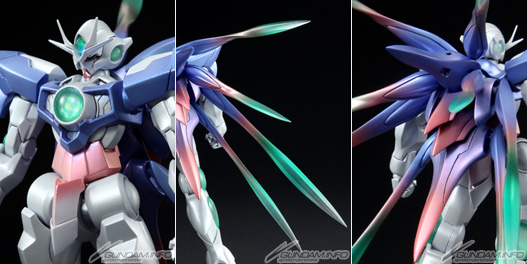 背面如同8片羽翼般的零件為透明樹脂製成,能夠完美表現出設定中向外延伸,逐漸變得透明的質感!頭部和胸部等設置於身體各處的GN電容也都是由透明樹脂製成!