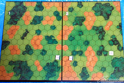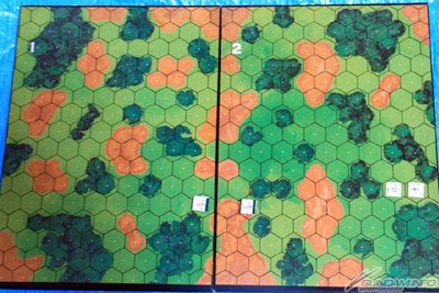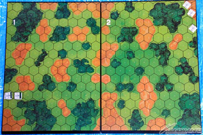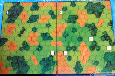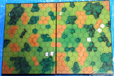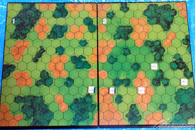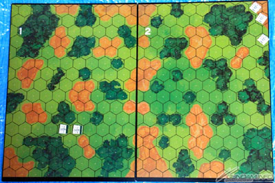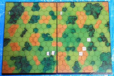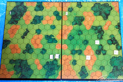 盒子內裝著一大張棋子表和空照圖般美麗的地圖、折疊起來的戰鬥解決表和記錄單、以及兩顆骰子。