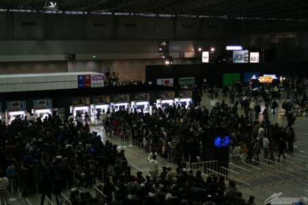 販售攤位「BANPRE屋」中,想獲得限定遊樂場商品的眾多來賓排成對列。
