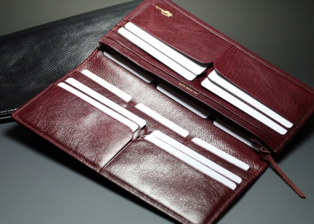 此外,為了讓皮夾能夠又薄又不容易變型,不使用一般皮夾所用又厚又硬的內襯材料,而是利用垂直方向開口,活用使用者裝入的信用卡等卡片的硬度,再加上為了使卡片放入取出都能毫無壓力順暢無阻,横向放入的卡片槽也使用了在皮夾業界革新的活頁型進行縫製,發揮了各式各樣的全新創意。