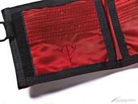 只要打開前面有兩顆扣子的口袋就可以裝入很多零錢,非常單純的二折式錢包。顏色為酒紅色,只有打開時才會出現吉翁公國軍紋章為其特點。