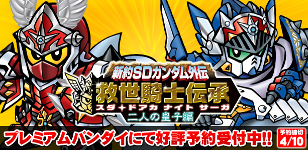 新約SD高達外傳 救世騎士傳承 斯搭・多阿卡・騎士傳說雙人皇子篇 價 格 : 7,140日圓(含稅)(運費・手續費另計) 預約受付: 2013年4月10日(三)16:00截止 商品發送: 預定於2013年5月發送 |