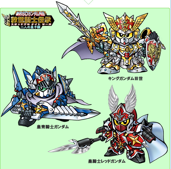 新故事是繼承過去發售 「SD高達外傳 圓桌的騎士篇」當中的歴史,本次是以「普利迪斯王國」誕生的“青”與“紅”二位皇騎士 「皇青騎士高達」「皇騎士紅高達」,還有在他們手下聚集的 「新生圓桌的騎士」們為中心展開的故事。