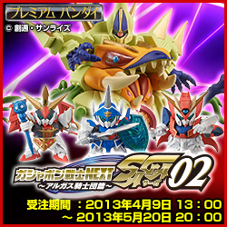騎士高達系列「阿爾卡斯騎士團」3人與敵方「吉翁三魔團」,再加上阿爾卡斯騎士團篇的最終頭目「魔物 THE O但丁」,收錄一般轉蛋商品無法模型化的65mm 大尺寸!全9種商品皆是全新造型!
