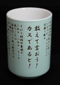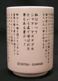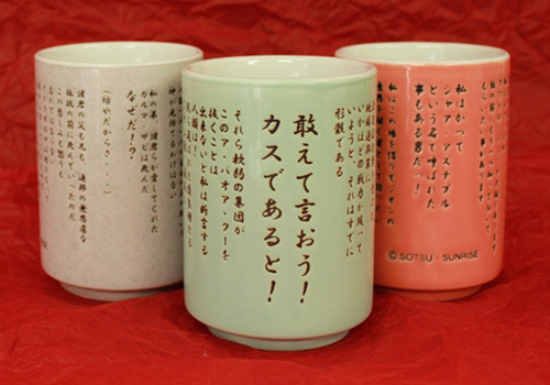 「ガンダムシリーズ 名演説湯のみ」は、ガンダム公式カフェ「GUNDAM Café」にて販売中の、劇中で印象的な名演説の数々が湯のみにプリントされたアイテムで、「ア・バオア・クー編」、「ダカール編」、「ガルマ・ザビ国葬編」の3種がラインナップされている。