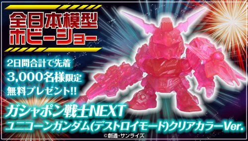 10 月11日(五)開始到13日(日)在千葉・幕張MESSE舉辦的「全日本模型HOBBY SHOW」的BANDAI攤位上,將在一般公開日的10月12日(六)、 13日(日)2天內,每天提供1,500個名額,2天共計送出3,000個名額,依先來後到的順序送給在攤位上填寫簡單問卷的嘉賓們「轉蛋戰士NEXT 獨角獸高達(毀滅模式)透明色Ver.」一台。