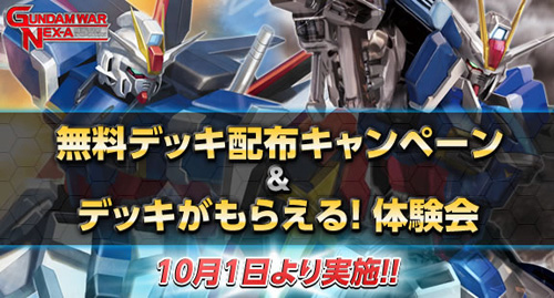 以「高達」的世界為舞台的對戰型集換式卡片遊戲「高達大戰NEX-A」將從今天10月1日(二)起在全國的NEX-A販賣店開始「免費套牌發送活動」,和「可以獲得套牌!體驗會」。