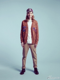 24,150日圓(含稅) 正面繡有「G」和「78」字樣的V領衫。採用日本縫紉家所製作的染線,有深度的色彩是其最大的特徵,並在素材當中加入了木棉而十分保暖。 |