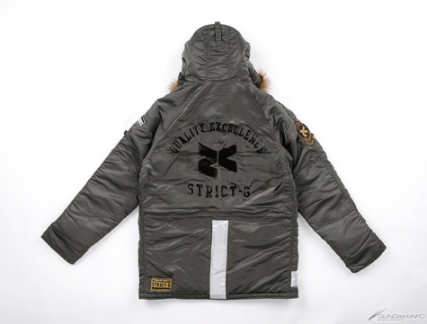 強調在道路上也能反光的冬季矚目商品,印在袖子補丁上的「自護尼克公司」LOGO和模版風格的背後印刷,都展現出STRICT-G監製的正統風格。