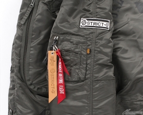 ▲右袖有STRICT-G補丁、緞帶為牛皮製的STRICT-G和ALPHA聯名緞帶,也同時附有普通版的紅緞帶。左袖為自護尼克公司和ALPHA公司的LOGO補丁。保證產品品質的「QUALITY EXCELLENCE」字樣既低調但卻又展現對品質的自豪。
