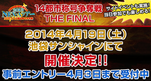 去年6月起在全國各地14個都市和香港、台灣舉辦的集換式卡片遊戲「高達大戰NEX-A」官方大賽「NEX-A Tour 2013」。決賽的「14都市稱號爭奪戰 THE FINAL」決定4月19日(六)在東京・池袋Sunshine City舉辦。