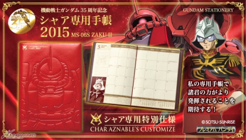 「馬沙専用筆記本2015」是為了紀念『機動戰士高達』誕生35周年的特別商品。除了在封面上印有馬沙・亞斯洛布的愛機「渣古II」之外,在封面的側面加上了金色。此外,月曆・週曆的頁面中也印刷了許多馬沙在劇中令人印象深刻的活躍場面。