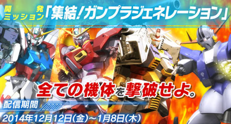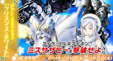 挑戰任務「雪白聖誕」當中,『高達創戰者』中登場的艾拉‧尤基艾寧所操縱的「沙煞比小姐」等白色機體將會來襲。而只要在戰鬥中獲勝,就有機會獲得具有「讓MS的防禦力大幅下降(-400)、1/2的機率會爆擊」効果的「附天線聖誕帽」。任務期間到12月25日(四)為止。