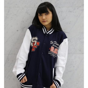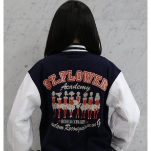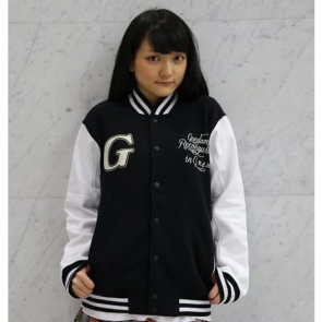 美式風格時尚經典款的吸汗棒球外套,鬆緊帶部分的線條配色特別凸顯出來。「ST FLOWER學園圖案」正面印上學院風標誌,背面印上「啦啦女孩」。「G-自我圖案」正面是讓人印象深刻的「G」標誌,背面則印上大大的「G-自我」,設計感相當衝擊。