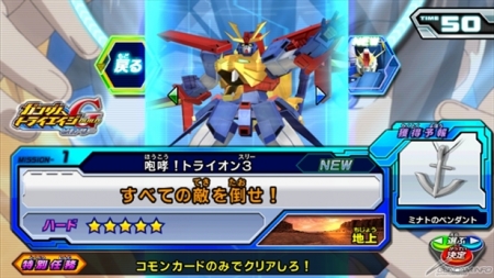 任務中會有「TRYON 3高達」、「高達ZZZ」、「高達AGE-3 普通型」3台機體襲來。成功過關任務後,可以把「TRYON 3高達」作為BUILT MS來開發。發布期間到3月11日(三)為止。