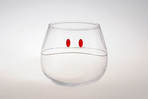 「哈囉玻璃杯」是以哈囉的臉為形象設計的玻璃杯。底面是採用球體的樣式,可以左右地搖晃。