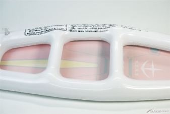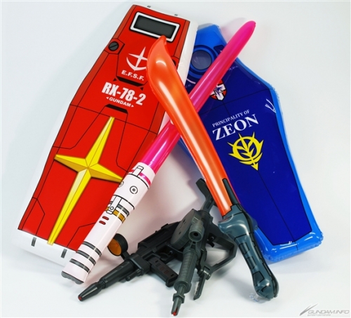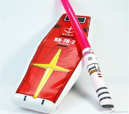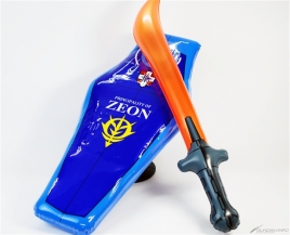 接著是介紹盾牌和軍刀的套組。本套組是類似海灘球的充氣玩具,這次發售的分別是高達盾牌 / 鐳射劍的套組和盾牌 / 電熱刀的套組。盾牌的表面有阿姆羅・雷和蘭巴・萊爾先生的個人標誌,整體外觀相當寫實。背面是可以用手握住的樣式,可以實際當做盾牌來擺姿勢。有這樣的玩具,相信就會想要大喊「這跟渣古是不一樣的、不一樣的阿!!」來揮舞,但因為大家都是大人所以還請忍耐。還有不可以拿來亂揮或是打人。不管如何請當作是享受氛圍的商品,也可拿來反擊剛剛介紹過的水槍,搭配來遊玩說不定會很有趣。