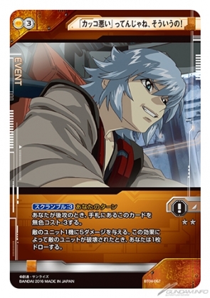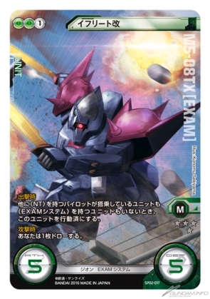 ▲出撃時雖然為已行動済,但3COST就有ATK5、DEF5在初期為強力的關鍵卡片。而且只要有持有特徴<NT>的駕駛員或持有<EXAM系統>的機體就不會變為已行動,可以一口氣進行攻撃!