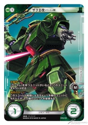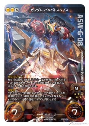 只要存在持有特徴<高達>的卡片時,ATK便會+5。此外還有給予敵方機體傷害時將其破壞的麻煩效果。