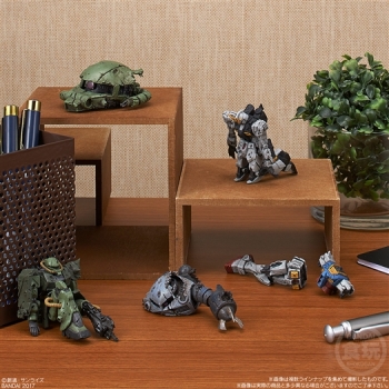 「機動戰士高達 MS Imagination」是將於戰場上受損的MS,寫實地再現的彩色公仔系列。除了有寫實的MS造型之外,連受損露出的内部骨架都完美地再現。除了可當作一般的公仔之外,也可當作桌上小物,只要放上公仔就能把書桌化身為戰場遺跡。本商品有全身型和部位特寫型,可活用於各種場景。