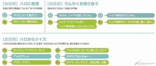 最大的特色是能說出強化角色世界觀的有趣對話,可對使用者的發言進行聲音辨識,以AI分析其意思和意圖,再從資料庫中選出最合適的對話,並以哈囉的聲音回答,還會出現角色、台詞和經典場景等,能享受圍繞著作品的各種對話。
