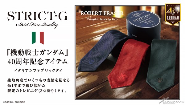 由融入高達世界觀的成衣品牌「STRICT-G」所推出,於今年迎接40週年的『機動戰士高達』和領帶製造商「ROBERT FRASER」合作的「義式領帶」,將於4月27日(六)發售。