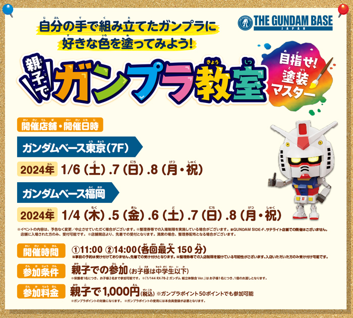 高達基地決定舉辦「親子高達模型教室 目標成為塗裝大師」!東京門市將於1月6日開始,福岡門市將於1月4日開始!
