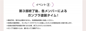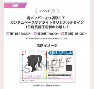本企劃作為、「GUNDAM BASE SATELLITE開幕3週年紀念活動」的一環實施。將於各門市實施「名片交遞會」,以及由成員進行「高達模型塗裝時間」。