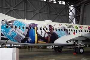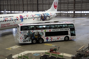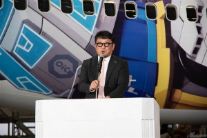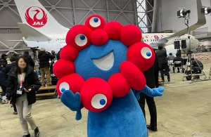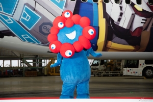 高科表示「這是第3架大阪・關西萬博設計的JAL噴射機。剛開始討論1號機時也有『Myaku Myaku(脈脈)太讓人不舒服畫上去真的沒關係嗎』的意見(笑)。Myaku Myaku(脈脈)最近也增加和各種角色聯名的機會,但還是第一次遇到身高差這麼多的聯名,讓人興奮。距離萬博開幕只剩41天,準備也進入最終階段。我希望能和『JAL高達JET』一起炒熱萬博氣氛」