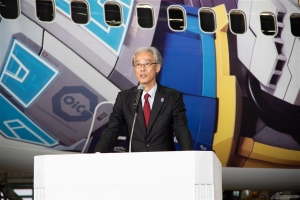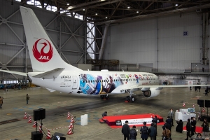今天3月3日(一)開航的大阪・關西萬博樣式「JAL高達JET」,在東京・羽田機場舉行新聞媒體揭幕式。