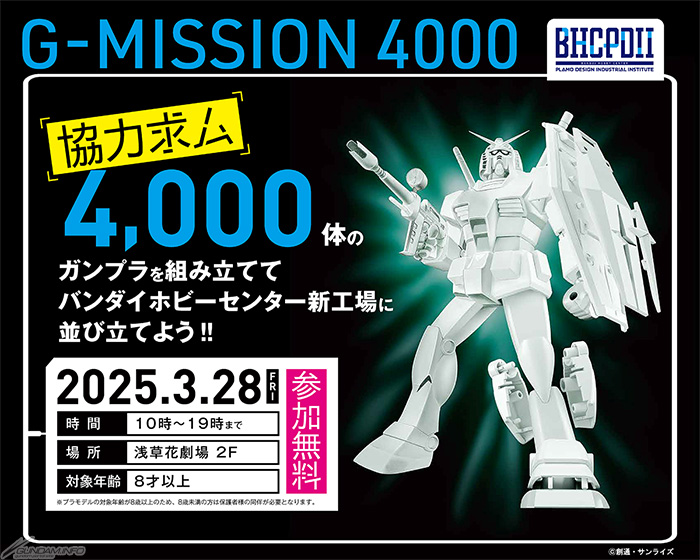 在BANDAI HOBBY CENTERの新工廠展示4,000架分量高達模型的計畫「G-MISSION 4000」開跑,第1次高達模型組裝會決定於3月28日(五)在東京・淺草花劇場舉辦。活動免費參加。