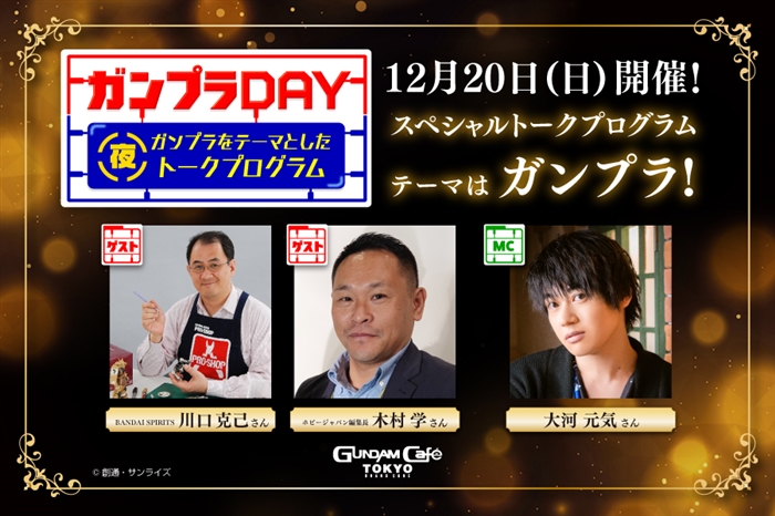 晚場將舉辦座談節目「GUNDAM Café 用來配飯的是…對談!高達模型」。主持人邀請了聲優大河元氣,來賓則邀請到川口名人和模型雑誌「HOBBY JAPAN」總編輯・木村 學,將從長年在最前線與”高達模型”對峙的2人的視角,展開以「高達模型40週年紀念商品」為中心的精采對談。