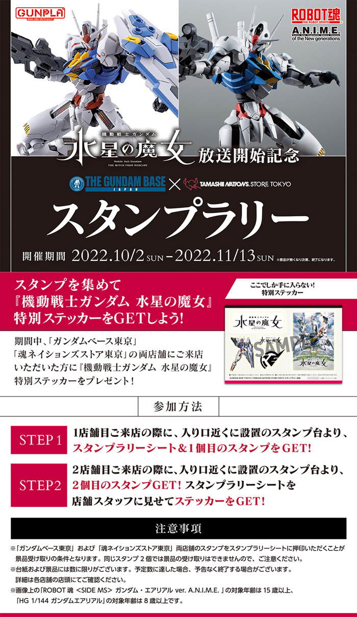 只要親臨高達東京基地和TAMASHII NATIONS STORE TOKYO兩間門市,蒐集共兩個印章,即可獲贈「『機動戰士高達 水星的魔女』特別貼紙」。