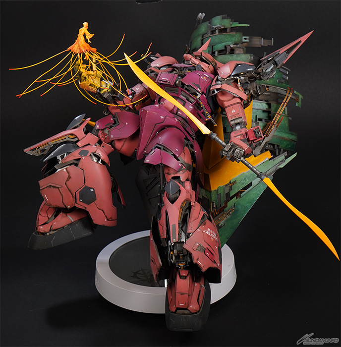 如同製作者「從任何角度觀賞都能享受樂趣的作品」這句說明,無懈可擊的作品。特別是鮮活的粉紅色,發色非常清晰。本體的完成度不在話下,以拼接製成的底座也很了不起。要在更上一層樓的話,我認為調整場景大小、採用電飾等,做出像是以MS為主角的構圖說不定會很不錯。