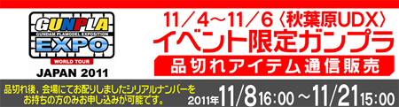 在月初舉辦的鋼普拉盛會「GUNPLA EXPO WORLD TOUR JAPAN 2011」,在會場所販售的活動限定高達模型中,於展期完售商品的網路通販將在Premium BANDAI・Hobby網路商店中販售至 11月21日(一)15:00止。