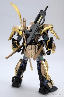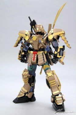 「MG 武者高達Mk-II 德川家康版」以德川家康裝飾初次上戰場時使用的盔甲『金陀美具足』為形象的樣式,由電鍍加工零件與特殊素材「和風原創貼紙」重現過往所沒有的厚重感與輝煌感的輪廓。