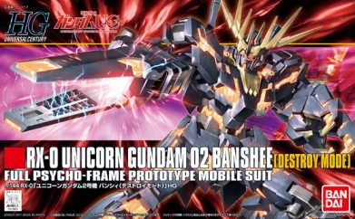 出自『機動戰士高達UC』的獨角獸高達2號機,通稱「報喪女妖」,發動“NT-D”的「毀滅模式」HGUC化!除了有可從裝甲的隙縫中看見的精神感應框架,還重現動畫原創新武裝展開後的狀態!另外還附有展開的盾牌、光束步槍、光束軍刀。