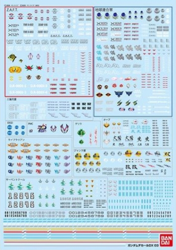 「高達貼紙DX」第3彈“SEED系”登場! 軍隊標誌、部隊標誌、數字標誌、線印記等重視泛用性所構成,還有一部分採用銀色標誌,更增加用途的“豪華”商品。推薦對應比例1/144。