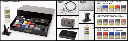 套組内容:鋼彈顏料15色組、稀釋溶劑1瓶、附有倒注口的量杯2個、空壓機1台、噴筆1隻、噴筆支架1個、專用收納盒1個