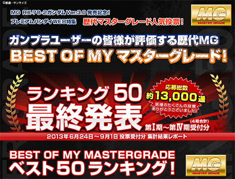 本次投票總共收到了來自高達模型玩家約13,000份的投票,在前50名的高達模型中榮獲第1名榮耀的是「MG ν高達 Ver.Ka」(2012年12月發售)。