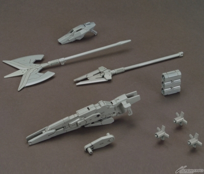 適合搭配自護系MS的豐富武器組在HGBC登場!「W光束戰斧」搭載了替換式的伸縮構造,可拉長至超過HG本體以上的大小!「感應砲莢艙」內附3個感應砲,採用改良至沙煞比裝備的造型!「火箭砲」可裝備在後背包,能使用握把和連接臂來呈現雙手握持姿勢!另外,擁有3mm孔徑的高達模型也可利用機械臂來裝備!還有內附可單手持的步槍!