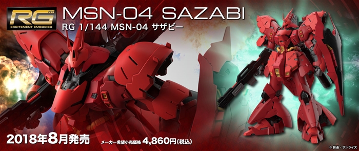 「RG 沙煞比」是搭載了1/144史上最大型機構的商品,除了可再現劇中姿勢的可動構造,也忠實地再現了腕部的氣缸和浮游砲等武裝。預定於8月發售,價格為4,860日圓(含稅)。