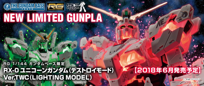 這次公開的有「RG 高達基地限定 獨角獸高達(破壞模式)Ver.TWC[LIGHTING MODEL]」、「HG 高達基地限定 獨角獸高達(破壞模式)[PAINTING MODEL]」2款。
