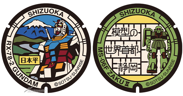 本次設置的「高達人孔蓋」,有描繪「RX-78-2 高達」和可以一覽富士山、三保松原和駿河灣的名勝景點「日本平」的高達設計,和以模型框架風格描繪的「MS-06F 渣古II」和「模型世界首都 靜岡」字樣的渣古II這2塊。
