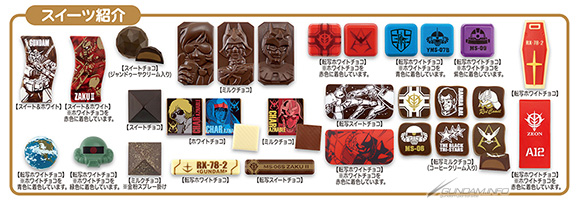 以「高達迷你贈禮」為首,還推出了「馬沙巧克力套組」、「一年戰爭巧克力贈禮」、「紅色彗星馬沙專用巧克力罐」、「馬沙VS高達巧克力贈禮」、「黑色三連星巧克力罐」、「藍色巨星賴巴.拉路巧克力罐」、「高達浮雕罐」共8種商品。以甜巧克力、白巧克力及牛奶巧克力為基底,轉印上徽章、角色及MS等圖案,是包含了各種設計的巧克力。