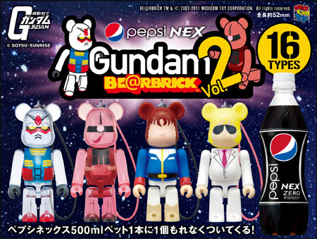 本活動是由「機動戰士高達」和「百事NEX」的共同合作,以高達系列當中受到歡迎的MS以及角色為基底而製作出全部共16種的 「BE@RBRICK」,每個500ml百事NEX 寶特瓶裝皆附贈1個。而本次的 第2彈則新增加「自護號」、「渣古尼羅」、「拉拉・遜」等新商品登場。